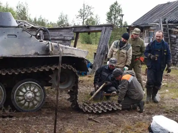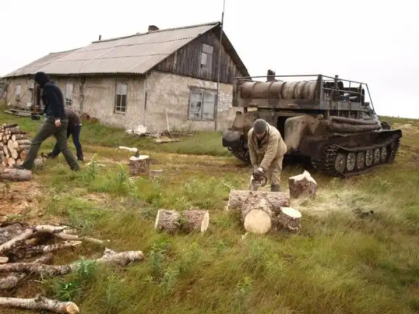 Бревно привязывали к обеим гусеницам сзади вездехода, а спереди ловили. Проходя под вездеходом, бревно зачастую ломается пополам - но нужно достать трос и палец, которыми оно привязано.