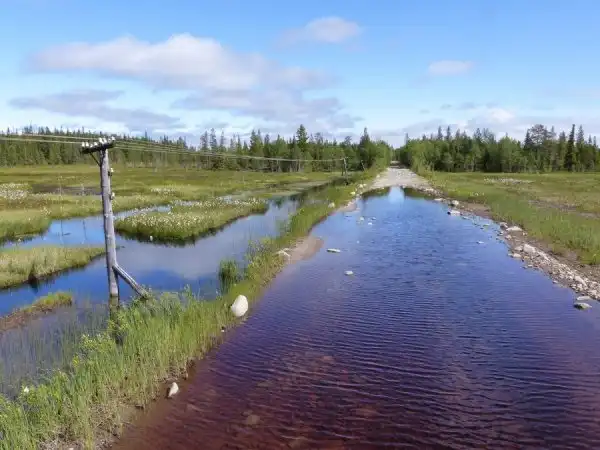Из-за холодной и дождливой погоды много воды, а впереди болото.