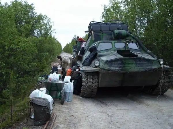 А вот и спасение - за нами приехали два вездехода, в один мы перегружаем вещи и едем дальше, а другой отбуксирует наш ГТТ.