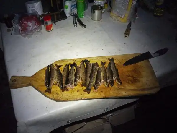 Форель, щука и хариус - основной улов наших рыбаков в этом сезоне. Этих маленьких форелек в жареном виде можно кушать почти целиком - отличное лакомство!