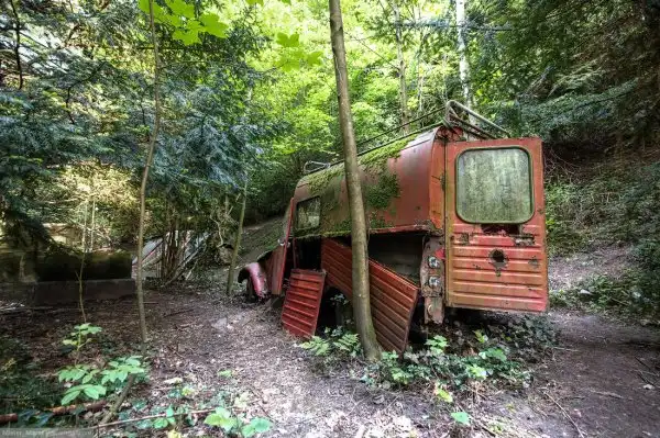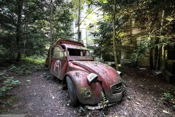 С самого утра начал накрапывать мелкий дождик, что, в целом, было только на руку сегодняшнему дню, учитывая его атмосферность. Первым на повестке дня стал замок Люмьер — еще ночью, когда я доехал до маленького городка, фары выхватили пустые глазницы окон и очертили силуэт спящего гиганта. Я очень люблю посещать заброшенные места ранним утром — таким образом возможность встретить других любителей забытого минимальна, и можно в одиночестве насладиться атмосферой места, которая у каждого своя. Спустившись с довольно крутого пригорка, я оказался у здания, где также томился скрытый от человеческих глаз старенький Ситроен.