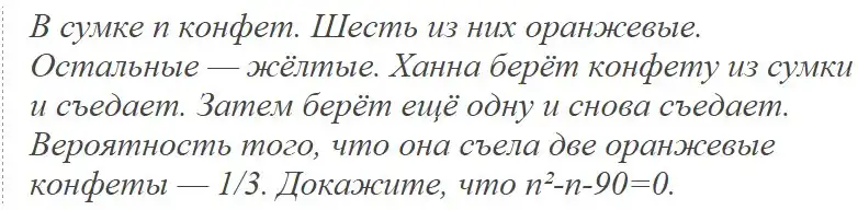 Вероятность того, что в первый раз Ханна вытянула оранжевую конфету — 6/n (в сумке шесть оранжевых из n конфет). Если в первый раз Ханна вытянула оранжевую конфету, то вероятность вытянуть такую же во второй раз — 5/(n-1). Вероятность вытянуть две оранжевые конфеты — произведение этих двух вероятностей.