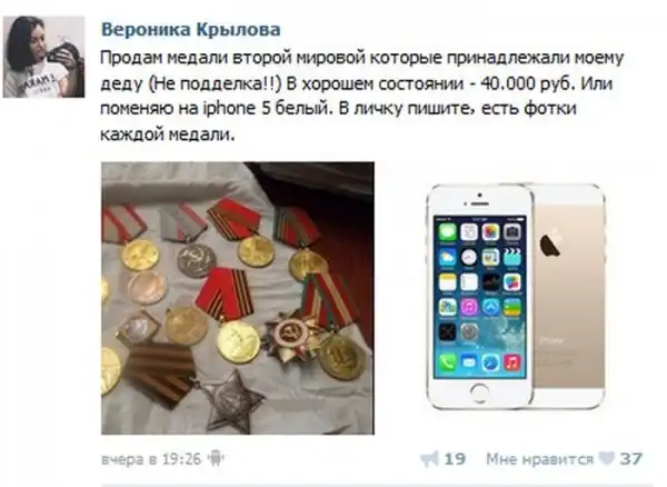 Отдельные представители нынешнего поколения все больше удивляют своим отношением к ценностям прошлого, в том числе и к памяти о Великой Отечественной войне. Например, для этой девушки, награды, полученные ее дедом во время войны, для нее ничего не значат и она готова продать или обменять их на смартфон популярной марки.