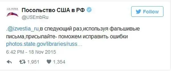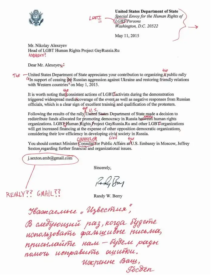 Посольство США в России ответило на статью газеты «Известия», в которой говорилось о поддержке Госдепом российских ЛГБТ-сообществ. В частности было сказано о том, что американцы могут финансировать ЛГБТ-активиста Николая Алексеева за его провокации в отношении наших чиновников. Ранее Алексеев заявил, что Герман Греф, Вячеслав Володин и Михаил Василенко являются геями. В публикации утверждалось, что это заявление является провокацией, а в качества доказательств использовали якобы письмо Госдепа ЛГБТ-активистам. Изучив это письмо, американское посольство нашло в нем множество ошибок, неверное указание должности и почтовый ящик не на том сервисе, которым пользуются чиновники США.