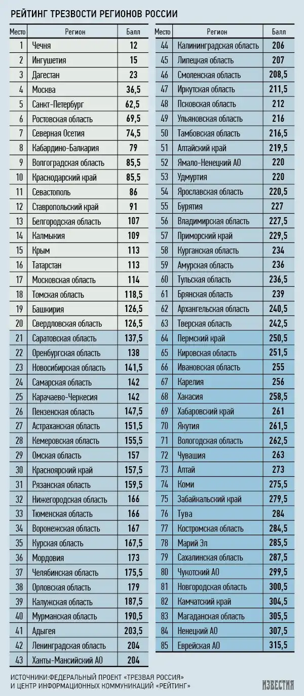 Совместными усилиями проекта «Трезвая Россия» и центра информационных коммуникаций «Рейтинг» был составлен «Национальный рейтинг трезвости». Все регионы сравнили по степени алкоголизации, используя для подсчетов шесть различных показателей - число страдающих алкоголизмом и алкогольными психозами, смертность от алкогольного отравления, сила антиалкогольного законодательства, объем продажи водки, объем продажи пива и преступления, совершенные в состоянии алкогольного опьянения. Так самым непьющим регионам оказалась Чечня, а самым пьющим - Еврейская АО.
