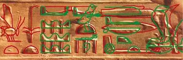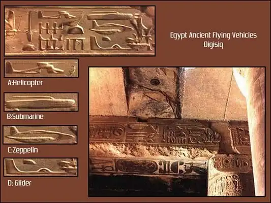Загадка «древнеегипетского вертолета» была решена археологами из Мюнхенского института египтологии в 1992 году. Изучив картинку, ученые пришли к выводу, что ее дорисовало время. Трещины, следы от штукатурки, сколы добавили детали — например, несущий винт «вертолету», пушку — «танку», хвост — «самолету». И «техника» обрела современный черты. На самом же деле все эти «конструкции» прежде были просто иероглифами.