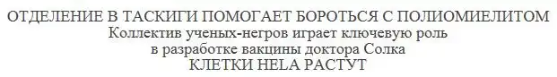 Уже через несколько месяцев команда из шести черных ученых и лаборантов построила в Таскиги фабрику, невиданную ранее: вдоль стен выстроились промышленные стальные автоклавы для паровой стерилизации, рядами стояли огромные чаны с механически перемешиваемой культуральной средой, инкубаторы, полные стеклянных бутылей для клеточных культур, и автоматические дозаторы клеток — высокие, с длинными тонкими металлическими ручками, впрыскивающими клетки HeLa в одну пробирку за другой. Каждую неделю команда в Таскиги готовила тысячи литров культуральной среды по рецепту Гая, смешивая соли, минералы и сыворотку крови, взятой у множества учащихся, солдат и фермеров-хлопкоробов, откликнувшихся на объявления в местной газете о сдаче крови за деньги.