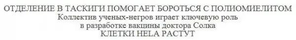С помощью этих клеток ученые смогли доказать эффективность вакцины Солка. Вскоре в New York Times появились фотографии склонившихся над микроскопами черных женщин, которые рассматривали клетки и держали в своих черных руках пробирки с HeLa. Заголовок гласил: