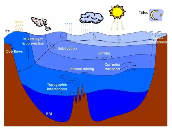 Морская вода становится более плотной по мере охлаждения, точка замерзания – 1,9°C, тогда как пресная вода наиболее плотная при температуре 4°C, а точка замерзания ее составляет 0°C. Средняя температура океанской воды составляет 3,5°C.