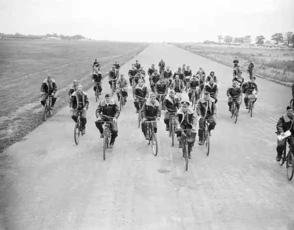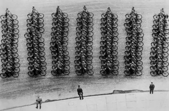 Немецкие велосипедные отряды участвуют в параде, который был организован в честь 50-летия Гитлера 20 апреля 1939 года