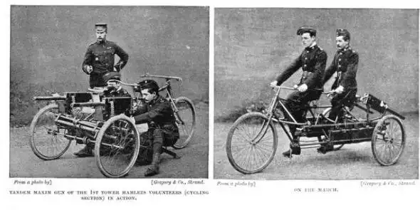 Трехколесный велосипед с двумя пулеметами Ма́ксима и большим запасом амуниции, разработанный Gregory & Co. ("Грегори и Ко"), 1898-й