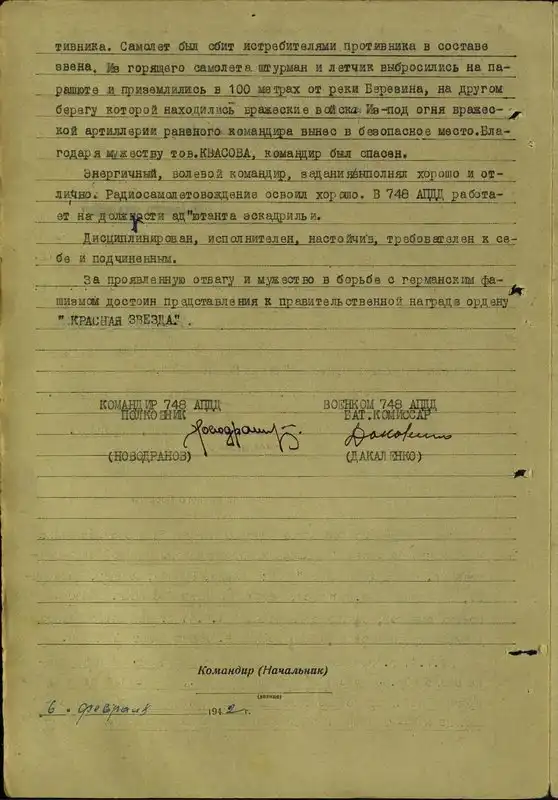 "Вот что написал мне Квасов в своем письме после того, как увидел фильм "Живые и мертвые", напомнивший ему через много лет о событиях 30 июня 1941 года под Бобруйском: "Наш 212-й отдельный дальний бомбардировочный авиационный полк, которым командовал тогда полковник, а ныне главный маршал авиации товарищ Голованов А. Е., получил боевой приказ: разрушить наведенные фашистами переправы через реку Березину, по которым они должны были переправлять свои наступающие танковые части с западного на восточный берег.