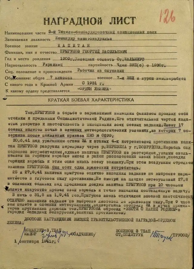 Но кто были эти летчики? Что за экипаж? Сопоставив воспоминания Симонова и Наградной лист с сайта "Подвиг народа", позволю предположить, что со сбитого ТБ_3 спасся экипаж капитана Георгия Прыгунова.