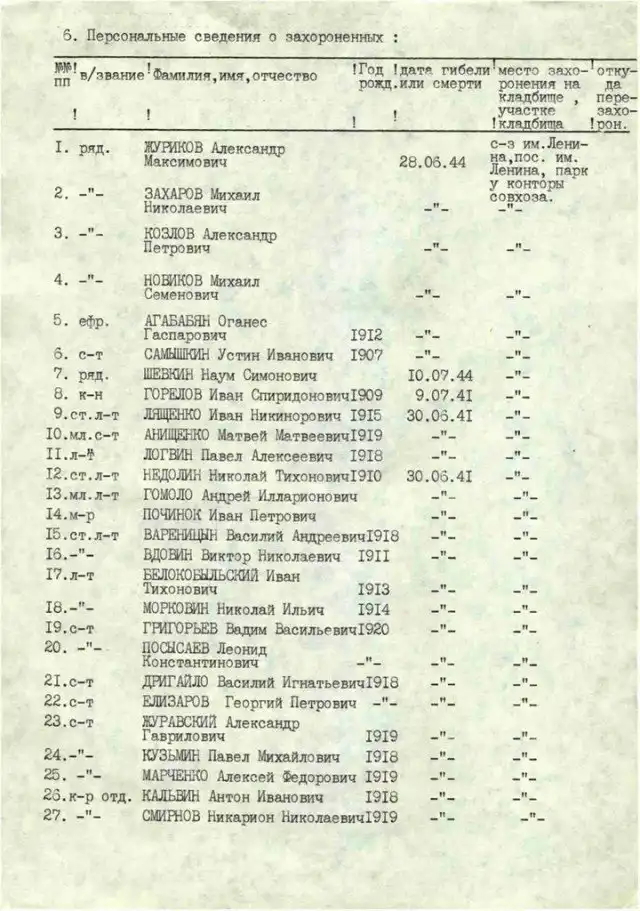 «В Бобруйский районный историко-краеведческий музей, расположенный в д. Сычково, обратился архивный исследователь из Москвы Г. Р. Рамазашвили с просьбой сообщить сведения об обстоятельствах гибели нескольких экипажей 212-го отдельного дальнебомбардировочного полка, сбитых 30-го июня 1941 года в районе Бобруйска и захороненных в братской могиле на территории пос. Ленина.
