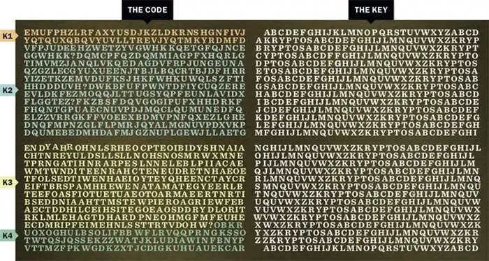 Таинственный текст моментально привлек к себе мировое внимание. На протяжении многих лет тайна оставалась не разгаданной. И только со временем секретная надпись начала проясняться. Весь текст был разделен на четыре фрагмента, условно обозначенных как К1, К2, К3 и К4.