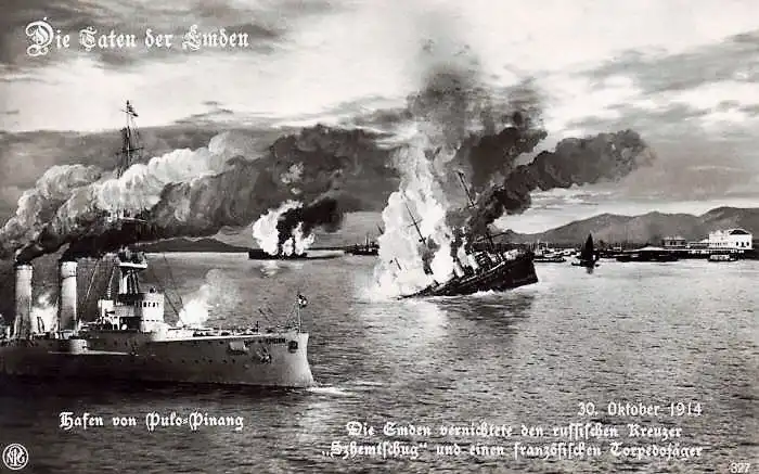 Однако британская разведка ошибалась. Командир «Эмдена», корветтен-капитан Карл фон Мюллер, в тот момент как раз подходил к гавани Пенанга, рассчитывая застать там французские броненосные крейсера «Дуплекс» и «Монкальм» и атаковать их. Крайне дерзкий план, граничащий с авантюрой – в одиночку соваться на два корабля, да ещё и превосходящих по силе. Помощниками немцев должны были стать утренний туман, предрассветные сумерки, сонливость наблюдателей, достаивающих «собачью вахту», и немного маскарада. Последний обеспечивался макетом дымовой трубы, собранным из дерева и брезента. Фальшивую трубу установили позади трёх настоящих, что сделало «Эмден» похожим на британский крейсер «Ярмут», который находился в этом же районе и участвовал в охоте на «Эмден». Согласно некоторым источникам, перед входом в бухту «Эмден» спустил немецкий флаг и вновь поднял его только непосредственно перед открытием огня, но это заявление не подтверждается документально. К тому же, фон Мюллера можно много в чём обвинить, но он был человеком благородным и до подобных откровенных нарушений морского права не опускался.