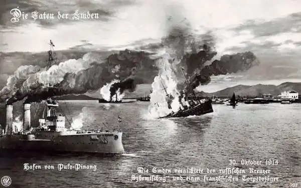 Наиболее ярким эпизодом начала Первой мировой войны на море стали рейдерские действия немецкого крейсера «Эмден». За неполные три месяца – с 3 августа до конца октября 1914 года – он успел навести ужас на Антанту в южном полушарии, захватив более двух десятков торговых судов и осуществив налёт на порт Мадраса, где уничтожил британские нефтехранилища. На неуловимого корсара была объявлена охота, участие в которой приняли корабли Англии, Франции, Японии и России. Последнюю представляли крейсера «Аскольд» и «Жемчуг», переданные под командование британского вице-адмирала Томаса Генри Мартина Джеррама. 28 октября 1914 года — «Жемчугу» и «Эмдену» было суждено встретиться в порту малазийского Пенанга.