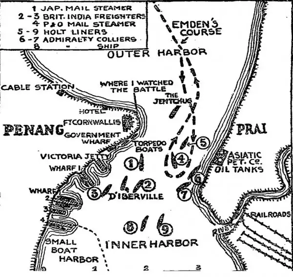 «Эмден» вошёл в бухту Пенанга ранним утром 28 октября (по старому стилю — 15-го). Всё прошло в полном согласии с замыслом его командира – корабль охранения (французский миноносец «Муске») не обратил на крейсер внимания, приняв его за своего, и даже просигналил прожектором: «Добро пожаловать».
