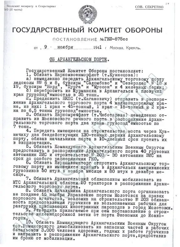Следующим шагом было постановление ГКО от 9 ноября 1941 года «Об Архангельском порте», согласно которому следовало принять следующие меры: перебросить в Архангельск из Мурманска, Ленинграда, Москвы все доступные подъемные средства (плавучие, железнодорожные), передать порту 70 грузовиков «ЗИС», 130 американских грузовиков в ноябре и декабре, создать железнодорожную ветку до находящейся на другом берегу Северной Двины Экономии. Особо необходимые краны были собраны практически со всей страны: от Владивостока и Нарьян-Мара до Мариуполя и Кирова. Также определялись меры по демобилизации и последующей защите от мобилизации («брони») 3000 человек из запасных частей и строительных батальонов. Эти требования были выполнены уже к концу ноября.