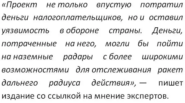 По словам экспертов, нерациональные траты связаны с неспособностью Агентства по ПРО анализировать альтернативные варианты и проводить независимою оценку стоимости проектов. Бывший глава Агентства Генри Оберинг, однако, заявил, что все неудачи – вина администрации Обамы и конгресса, которые не увеличили финансирование.