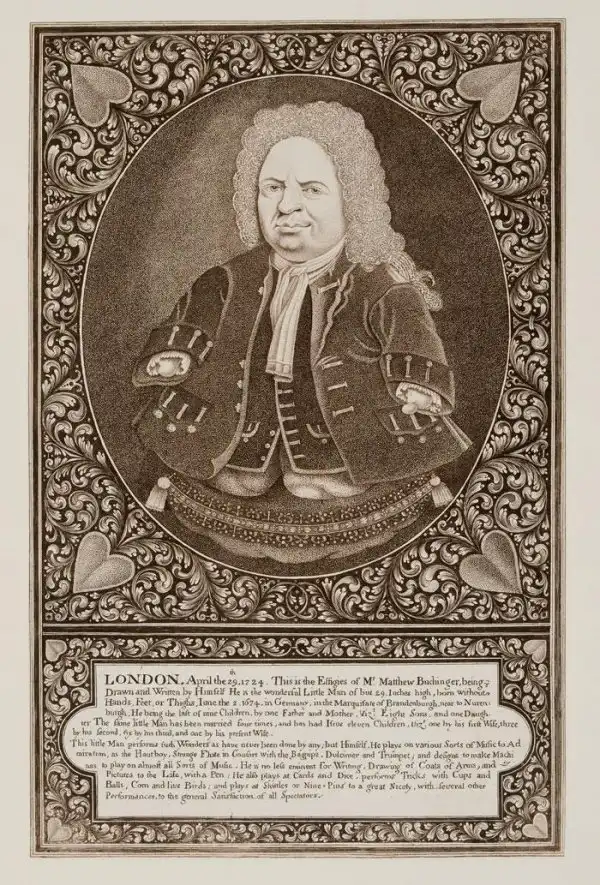 Этот человек родился в 1674 году в Германии. У мужчины отсутствовали руки и ноги, но это не помешало ему обучиться выполнению даже самых сложных действий. У Матиаса был красивый аккуратный почерк – буквы он выводил с помощью губ. Человек-торс не только умел читать и писать, но и свободно разговаривать на 4-х иностранных языках. Матиас удивлял окружающих магическими фокусами и великолепной игре на музыкальных инструментах. Своими умениями мужчина сумел завоевать признание многих. Ныне в Британском музее находится искусно задекорированый веер, который Матиас самостоятельно сделал для оксфордской княжной.