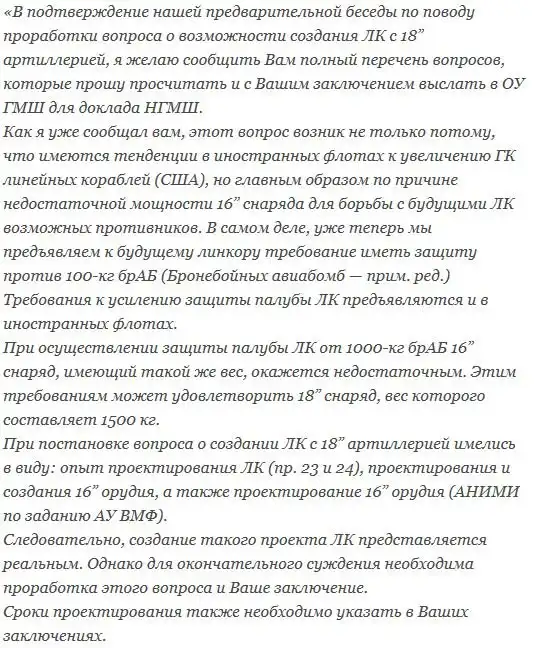 Еще меньше известно о проекте советского линкора с 457-мм (18-дюймовыми) орудиями. Появление этого калибра в предварительных разработках советских конструкторов обычно относят лишь к 1948–1949 годам. Однако в известной книге А. М. Васильева «Линейные корабли типа «Советский Союз» упомянуто следующее: