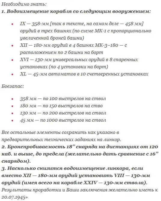 Можно предположить, что суперлинкор создавался с оглядкой не на проект 24, а на германский линкор «Н» — точнее, на те туманные представления, которые сложились о нем к этому времени у советских кораблестроителей. 30 июля начальник 4-го отдела РУ ГМШ ВМФ инженер-капитан 1 ранга Васильев отправил в адрес начальника 2-го отдела УК ВМФ инженер-капитана 2 ранга Котова теоретический чертеж корпуса «немецкого линкора „Н”», уточняя: «Речь идет, видимо, о новом проекте линкора». Заключение по проекту предлагалось сообщить не позднее 1 августа 1945 года.