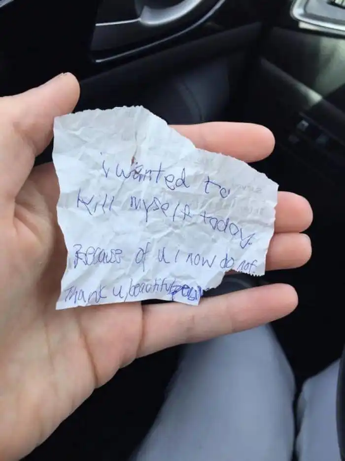 После задушевного разговора Крис попросил девушку подождать еще пару секунд и что-то написал на чеке. Кейси взяла записку, но открыла ее лишь в машине. Это послание потрясло девушку до глубины души. Крис написал: «Сегодня я хотел покончить с собой, но ты заставила меня одуматься. Спасибо тебе, прекрасный человек».