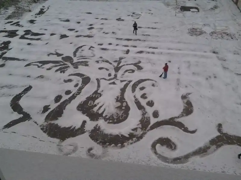 Идея творить на снегу пришла спонтанно - надоумили школьники. Они же и стали благодарными зрителями. Семен Бухарин не рвется к славе. Говорит, это все для детей. Школота в ответ называет его великим художником.