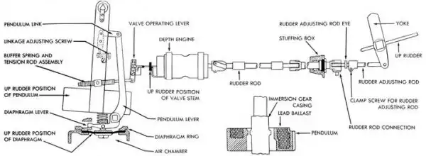 За удержание торпеды на необходимой глубине отвечают горизонтальные рули, связанные с датчиком давления. Сравнительно простая система с обратной связью корректирует угол наклона горизонтальных рулей таким образом, чтобы удерживать торпеду в зоне давления, соответствующего выбранной глубине. При нулевой скорости всё просто: на датчик действует лишь гидростатическое давление, пропорциональное глубине погружения. Но торпеда движется, а в этом случае начинает работать дополнительный фактор — гидродинамическое давление у поверхности корпуса. Учитывать его гораздо сложнее, поскольку оно связано со скоростью обтекания, а эта скорость на разных участках поверхности корпуса различна. Соответственно, гидродинамическое давление на различных участках корпуса может становиться либо выше, либо ниже гидростатического.