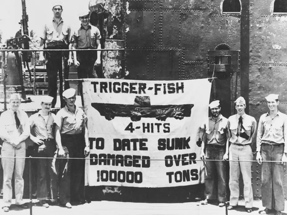 Члены экипажа SS-237 «Триггер» на фоне закреплённого на рубке