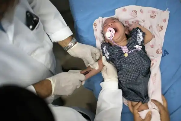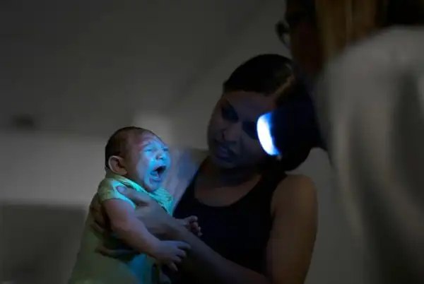 Доктор берет анализ крови у родившейся с микроцефалией Луаны.