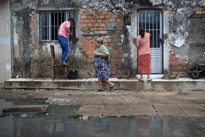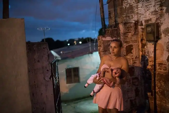 27-летняя Глейзе Келли да Сильва и ее дочь Мария, родившаяся с микроцефалией, у ворот своего дома. Трущобы бразильского Ресифи буквально кишат комарами-переносчиками вируса Зика благодаря большому количеству сточных канав, огромных луж в дорожных выбоинах и прудов на месте карьеров, куда местные жители зачастую выбрасывают мусор.