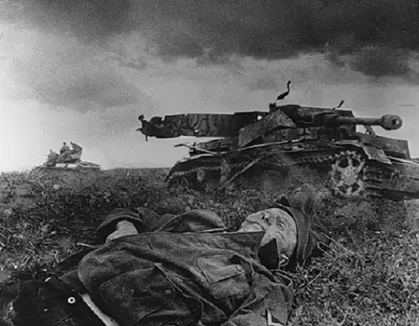 Не помню, как вернулся в окоп. Схватился за оружие. Перед нашими позициями замелькала немецкая пехота. Вражеские командиры, чтобы прикрыть свою технику от наших гранат, послали вперед своих солдат. Фашисты хотели зачистить позиции 4-й роты. Кто-то скомандовал: «Огонь по пехоте». Значит, живы еще офицеры. Пулемет с моего фланга заработал, а слева молчал. А ведь именно на том направлении немцы подобрались ближе всего к нашим окопам. Я побежал туда. Пробираясь по полузасыпанной траншее видел, что всюду убитые, разорванные взрывами, раненные с оторванными руками, ногами. От нашей роты, к тому моменту, уже мало что осталось. Перепрыгивая через разбитые ящики, дырявые каски, покореженное оружие, я добрался, наконец, до позиций пулеметчиков слева. Их «максим» лежал на боку рядом с блиндажом. Бойцов рядом не было, неужели бросили оружие и бежали? Я выровнял пулемет, достал из коробки и вставил ленту. Мы открыли огонь как раз вовремя. Немецкая пехота уже стала подниматься у самой линии наших окопов. Они приблизились на расстояние броска гранаты. Наша пулеметная точка находилась немного на возвышенности. Фашисты были у нас как на ладони. Всю ленту расстреляли по "гансам" и обратно закопали их в грязный, кровавый снег. Десятка два скосили, не меньше. Поле у позиций роты, к тому времени, было усеяно телами врагов. Все вокруг было уже не белое, снежное, а черное, перекопанное взрывами, испачканное кровью, пороховой гарью, танковым маслом. Семь танков и самоходок горели.
