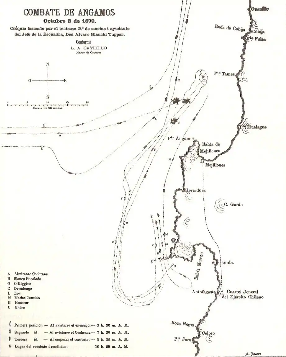 Ночью 8 октября «Уаскар» и «Юнион» вошли в залив Антофагасты и, не найдя там целей, двинулись дальше на север. В 3:30 утра Грау и Риверос обнаружили друг друга. Чтобы уклониться от встречи, «Уаскар» взял курс на юго-запад, а затем повернул на север. 1-й дивизион чилийцев преследовал его, но явно отставал. Ситуация решительно изменилась, когда на северо-западе появились дымы 2-го дивизиона. Против 11 узлов «Уаскара» «Кокран» дал 12, и расстояние между судами начало сокращаться. В 9:40 пушки «Уаскара» открыли огонь с дистанции в 1000 метров и сумели добиться 5 попаданий, из которых одно не пробило брони, а остальные не повлияли на боеспособность «Кокрана».