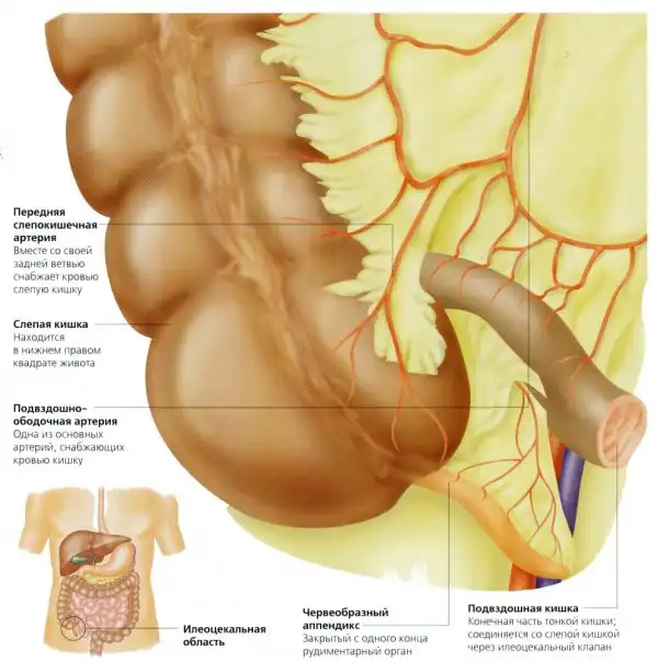 Аппендикс, или червеобразный отросток – придаток слепой кишки, который отходит от ее заднебоковой стенки. Имеет форму цилиндра, длина которого от 6 до 12 см, а диаметр 6-8 мм. Аппендикс может располагаться сбоку, снизу, даже сзади от слепой кишки, а иногда он прилегает к мочеточнику или почке. Если аппендикс расположен необычно, то он усложняет диагностику воспаления и затрудняет ход операции.