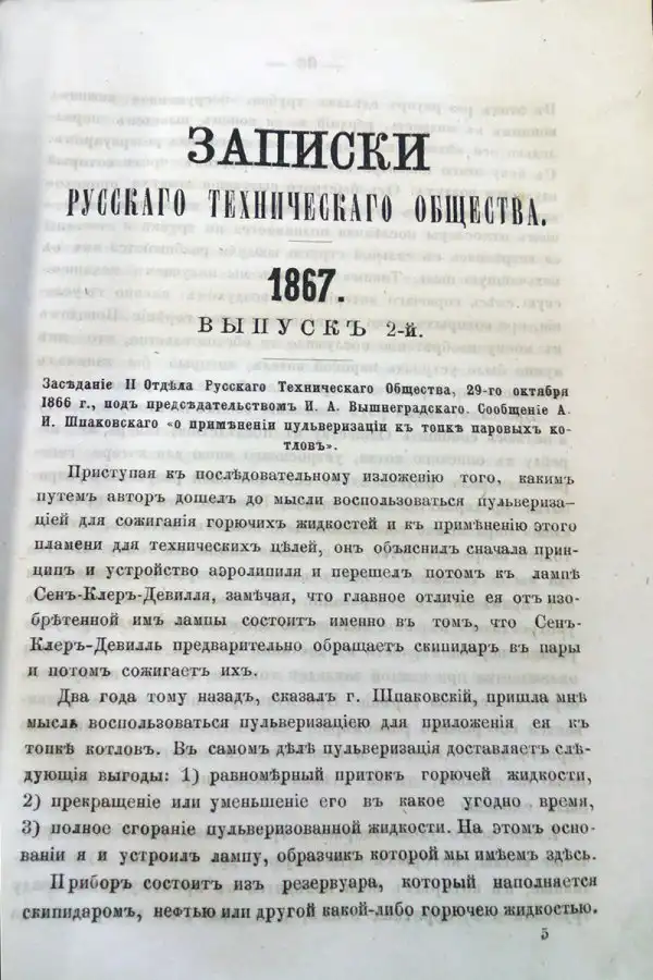 Первым сообщением за 1866 год отраженным в деятельности Императорского русского технического общества (ИРТО) числится сообщение от 29 октября А.И. Шпаковского — о применении пульверизации к топке паровых котлов.