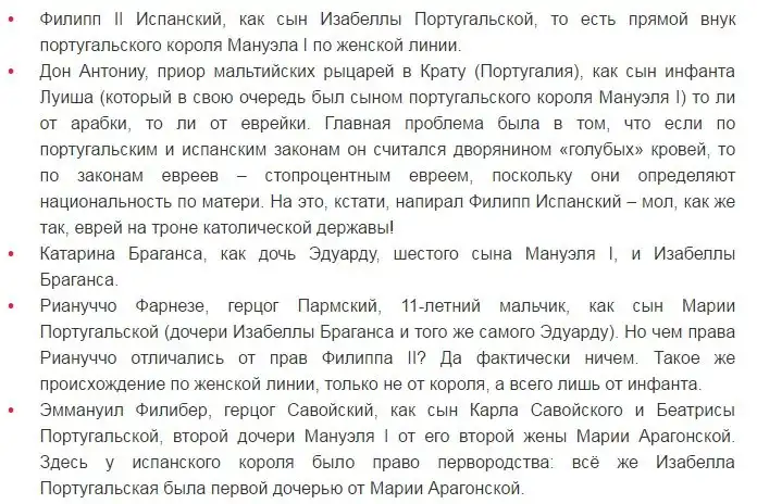 С Риануччо и Эммануилом Филибером договорились очень просто – первый был сыном Алессандро Фарнезе, который состоял на службе у Филиппа II, второй сам служил у португальского короля. Обоим объяснили, что объединение Португалии и Испании под одним скипетром – это хорошо, дали денег, и они особо на своих правах не настаивали.