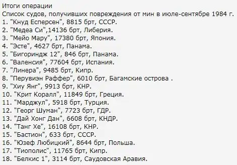 Кстати, операция по разминированию Суэцкого залива Красного моря, прошедшая в 1973-1974 гг. с участием того же ПКР "Ленинград" и тоже закончившаяся уничтожением 10 мин, находится в перечне военных конфликтов СССР. Все ее участники, включая и экипажи судов обеспечения, являются участниками боеќвых действий.