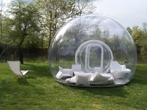 Bubble TreeПрозрачные хижины достаточно просторны - их диаметр составляет 4 метра, оснащены сборным деревянным полом и легки в установке. Специальный вентилятор (он входит в комплект) нагнетает воздух, создавая давление на стенки капсулы, поэтому она не теряет форму. Благодаря акустическим свойствам стен никакие посторонние звуки не нарушают тишину, царящую под куполом сферы.