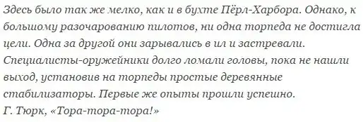 В связи с этим остро встал вопрос о возможности использования самого эффективного противокорабельного оружия палубной авиации – авиаторпед. Тогда же, в январе 1941-го, через того же Фумио Айко и от имени Управления авиации Министерства флота, в котором тот теперь служил, было организовано распоряжение командиру авиабазы Йокосука о возобновлении работ по данной проблеме. Но поскольку из-за соображений секретности нельзя было указать истинную цель этих работ, то их приоритетность оставалась всё ещё низкой. Здесь нужно напомнить, что адмиралу Ямамото удалось буквально продавить официальное одобрение своего плана лишь в октябре 1941 года, а до этого все посвящённые ему приготовления оставались не более чем личной инициативой Главкома Объединённого флота.