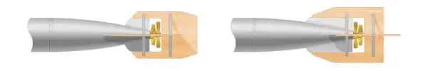Ещё во время испытаний опытных образцов выяснился «побочный эффект» от применения этих дополнительных стабилизаторов – связанные с датчиками давления самописцы, устанавливаемые в испытательных головных частях торпед, показали, что в ряде случаев происходит уменьшение глубины «нырка» после входа торпеды в воду. Особенно этот эффект появлялся в случае маловысотного сброса на малой скорости. С одной стороны, деревянные стабилизаторы работали в качестве своеобразного гидродинамического «парашюта», несколько снижая скорость торпеды в момент входа в воду. С другой, что гораздо важней, они предотвращали вращение торпеды вокруг продольной оси во время полёта.