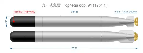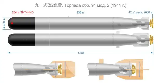 Между тем неспешная работа конструкторов из военно-морского арсенала в Йокосуке принесла, наконец, свои плоды – была создана новая модификация торпеды обр. 91. От первой версии её отличали увеличившаяся длина и облегчённый танк для сжатого воздуха, что позволило увеличить массу заряда в боевой части со 150 до 203 кг тротил-гексиловой смеси. Торпеда также получила четыре дополнительных стабилизатора, установленных под углом 45° к основным.