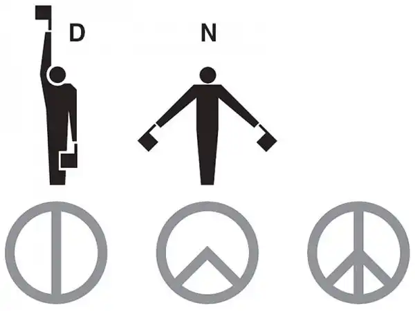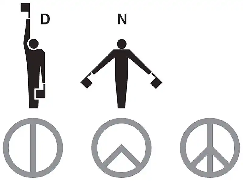 Холтом взял и соединил две буквы из этого алфавита: N и D, первые буквы слов Nuclear Disarmament. В семафорной азбуке символ D показывается одним флажком строго вверх, другим — строго вниз, а символ N — флажками, разведенными в стороны и вниз. При наложении этих фигур друг на друга и получается всем нам знакомый знак «Пацифик».