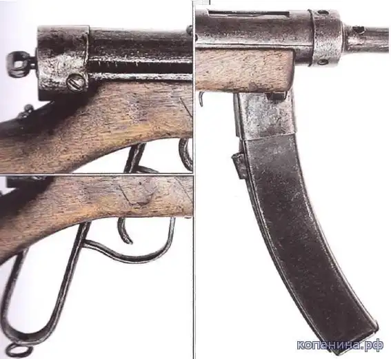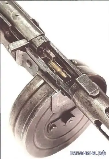 сбоку пистолета-пулемета. Дальнее положение соответствует одиночному огню, ближнее — автоматическому. Пистолет-пулемет использует дисковые магазины на 71 патрон от ППШ. Нарезной ствол, также как и затворная коробка от СВТ-40. К патроннику приклепан кожух ствола с окнами для циркуляции воздуха. Прицельное приспособление состоит из мушки, защищенной намушником которая приклепана на кожух ствола около дульного среза. Приклад деревянный, ружейной формы. На прикладе имеются многочисленные мелкие надрезы — следы его использования в качестве хозяйственной доски для нарезания продуктов.