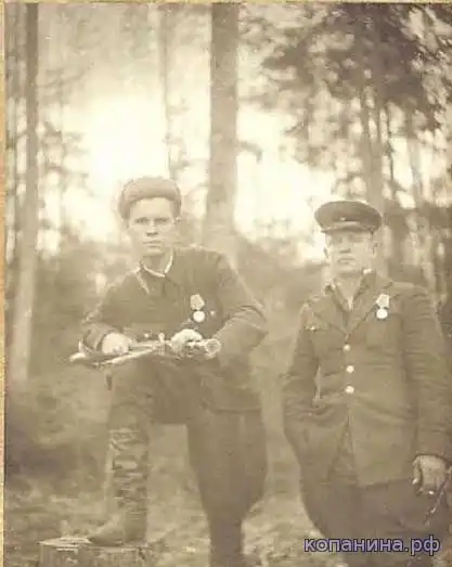 Слева - И. С. Жидович, оружейный мастер отряда «Искра» бригады «Разгром». 1973 г. , справа - В. М. Володько Гребенщиков, оружейный мастер отряда «Искра» бригады «Разгром»
