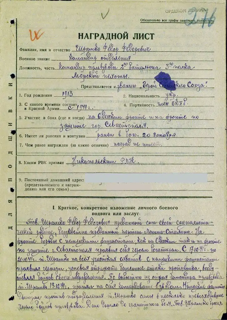 «…Тов. Шрамко Федор Федорович, 1913 г.р., чл. ВКПб – преданный сын своей социалистической Родины, беззаветно преданный партии Ленина-Сталина. На фронте борьбы с немецкими фашистами, как на Одесском, так и на фронте по защите г. Севастополя проявил себя героем-богатырем. С 17.12.41 по 20.12.41 гг. тов. Шрамко на всех участках схваток с немецкими фашистами проявил героизм, успевая отражать бешеные