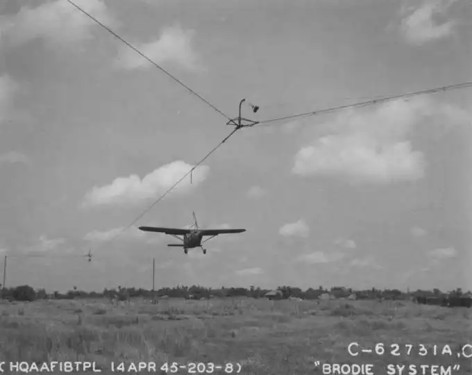 Он заинтересовался идеей и сумел ее пробить, так что в конце концов в апреле 1943го Броди переводят из артиллерии в ВВС, определяют на аэродром в Новом Орлеане, дают ему 10000 долларов и легкий самолетик Taylorcraft L-2. Там Броди строит систему мачт и тросов (главный взлетно-посадочный трос имел длину 150 метров), и с помощью армейского пилота лейтенанта C C Wheeler в конце августа осуществляет первый взлет с троса, а 3го сентября и первую посадку. Дальнейшие работы проходили с участием пилота-сержанта Raymond Gregory и более тяжелого самолета Stinson L-5.