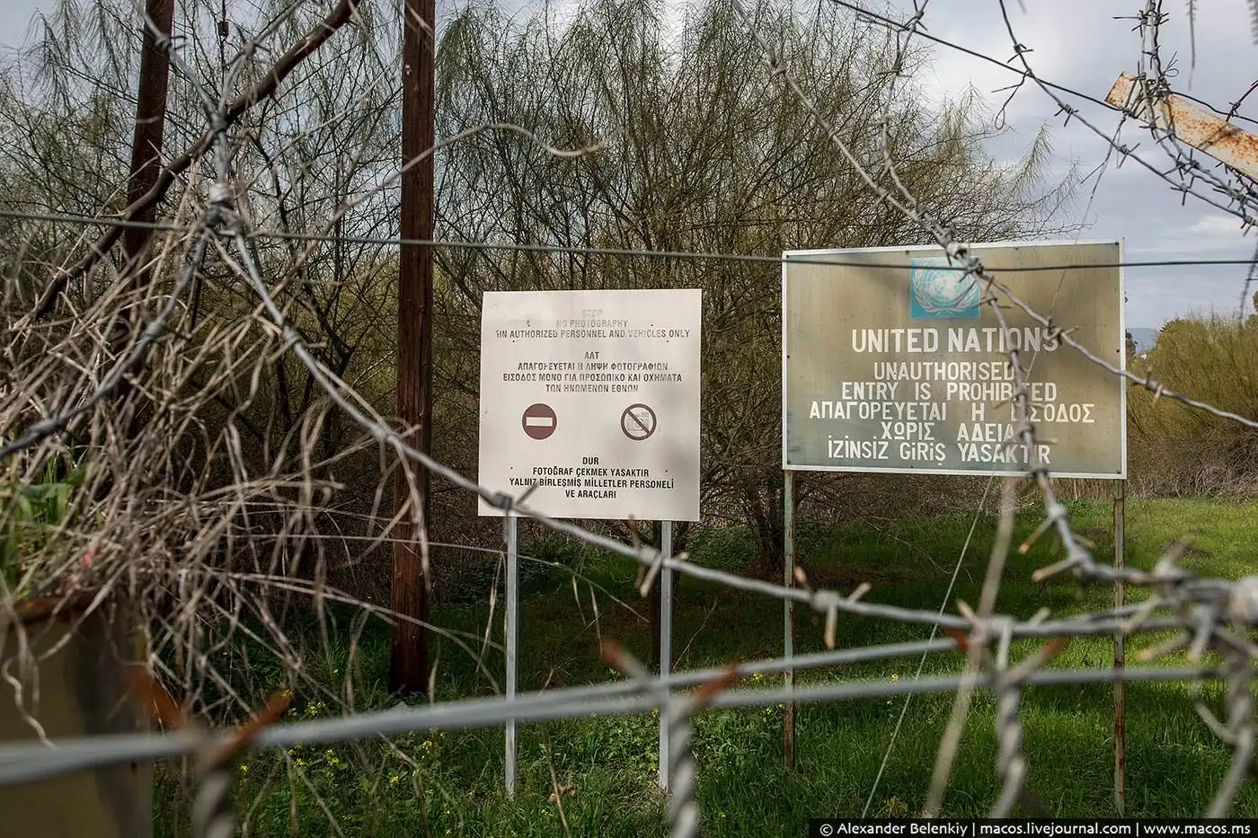 Буферная зона острова Кипр находится в отчуждении и контролируется войсками ООН. Сюда не то что проходить нельзя, а даже фотографировать этот знак!
