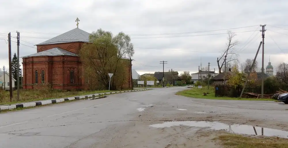 Официально во Владимирском живёт 1,7 тысяч человек, но на глаз я бы дал самое большее две-три сотни - село выглядит небольшим и тихим, но исключительно (по меркам нечернозёмного села, конечно) ухоженным. От въезда видны две его церкви - Никольская (1915) и Владимирская (1766), вторая и дала селу нынешнее название, а прежде оно называлась по протекающей реке - Люнда